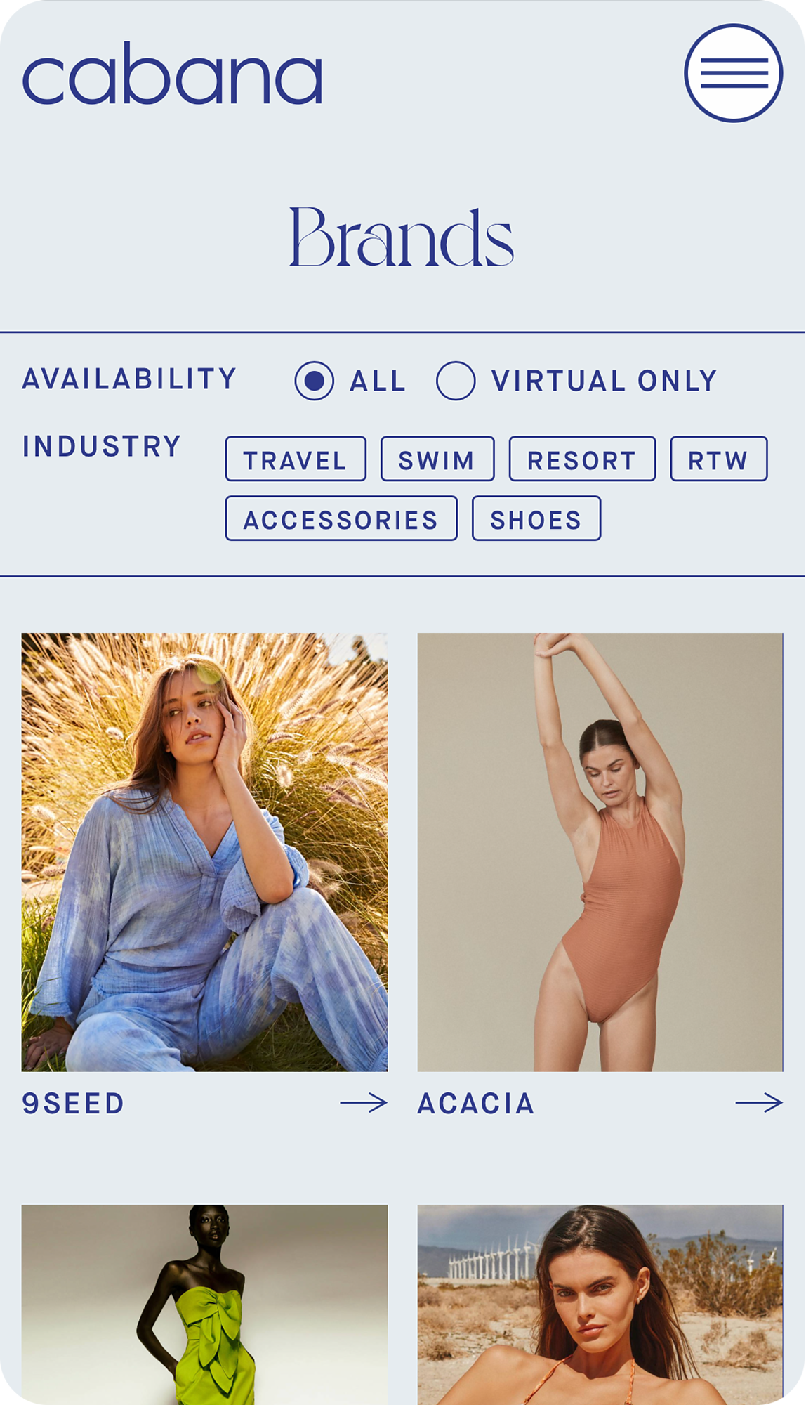 As a result of the pandemic, Cabana, a trade show focused on travel and swim, needed to update their website to accommodate for online shows. Working with their team, we strategized a brand update and site design that not only created a seamless experience for their partner’s to showcase their work, but also established a stronger brand story. Through a combination of fluid UX, editorial moments, and special touches inspired by wanderlust, the new website integrates strong product design and a clear brand narrative.
